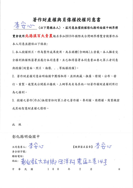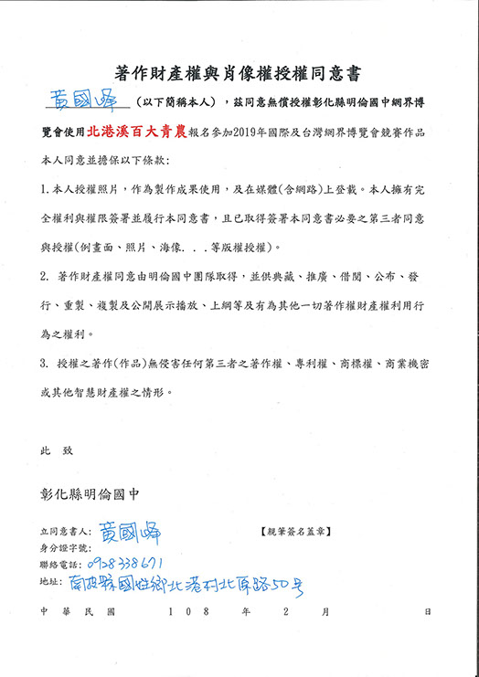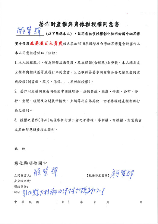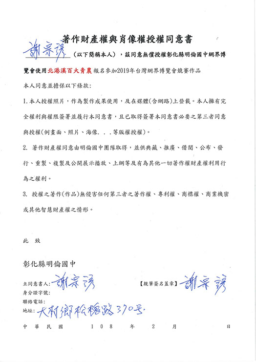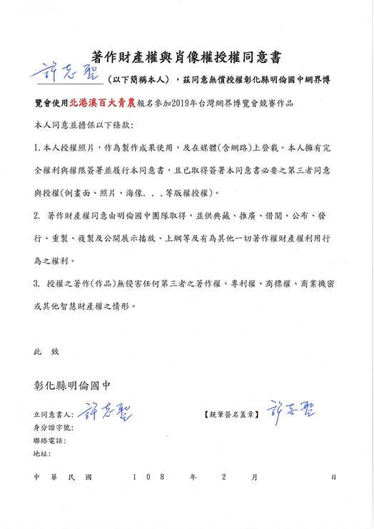 以下展示的是我們受訪對象的,著作財產權與肖像權授權同意書。