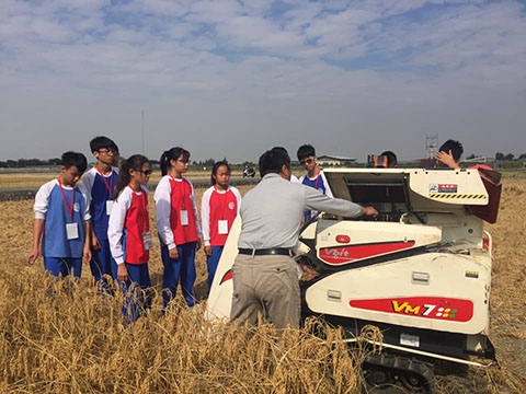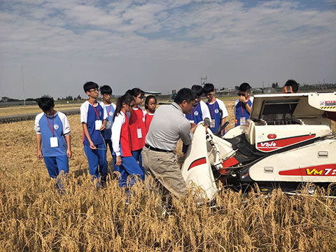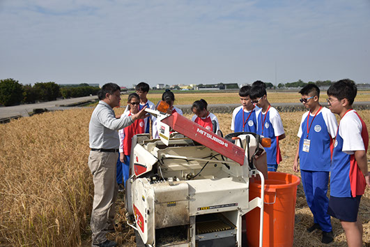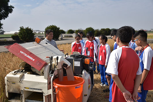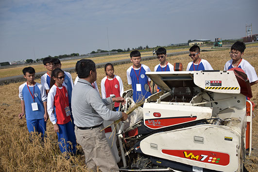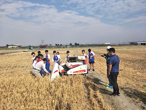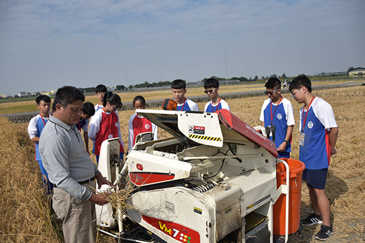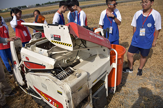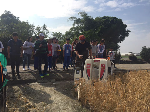 水稻收穫機要下田時,首先要在下田的位置先把稻穗先割一塊起來,讓機器可以下田去工作,我們在旁邊看臺中區農業改良場的顏先生操作機械,看他操作好像很輕鬆,但我們都知道,這是累積多年的經驗才學會的技巧。接下來再由李先生講解水稻收穫機的構造及原理。