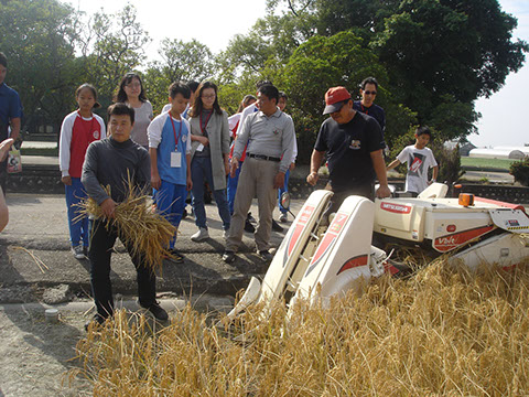 水稻聯合收穫機參訪行程,我們主要安排在臺中區農業改良場裡進行。我們在這裡看到的是一台兩行式的水稻收穫機,這是一台迷你型的水稻收穫機,我們常在外面看到的水稻收穫機通常都是一次可收割六行到八行。麻雀雖小五臟俱全,水稻收割、稻穀脫粒、稻穀裝袋以及稻草切斷等工作都可以一次處理完成。