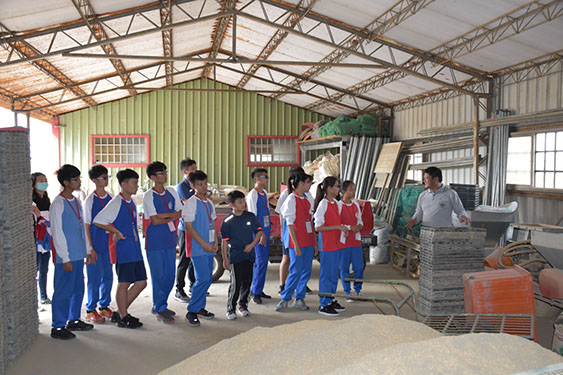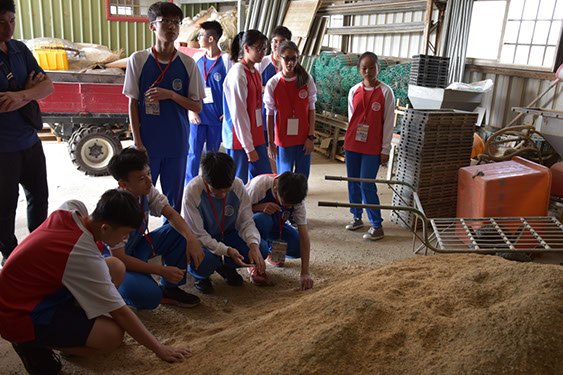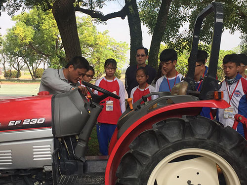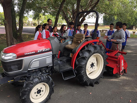 接著背起動力噴粉噴粒施肥機,雖然裡面沒有裝肥料,但是大家都覺得好重。背一下子肩膀就很痠了,所以做農夫是要有很好的體力才能勝任,因為很多工作都要用到力氣。農場裡還有搬運車、鏟斗機、噴藥車、肥料攪拌機及輸送機等農機具。