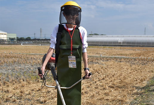 我們這次在水稻管理機械參訪行程是安排去臺中區農業改良場及新豐農場參觀。首先在農改場部分隊員們先聽取簡報,接著穿起割草作業用的全套護具,模擬割草的情形。因為割草有潛在的危險所以護具必須要非常的完整,從頭到腳有頭盔、護目鏡、耳罩、防護衣、手套、雨鞋等。
