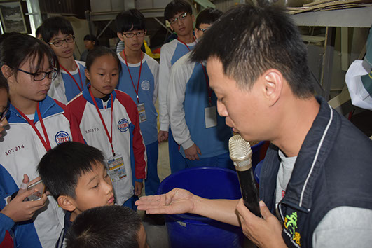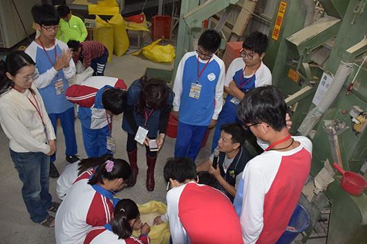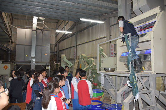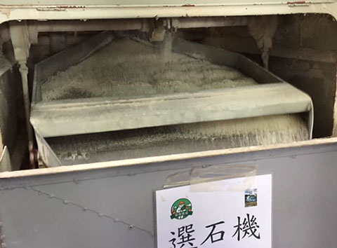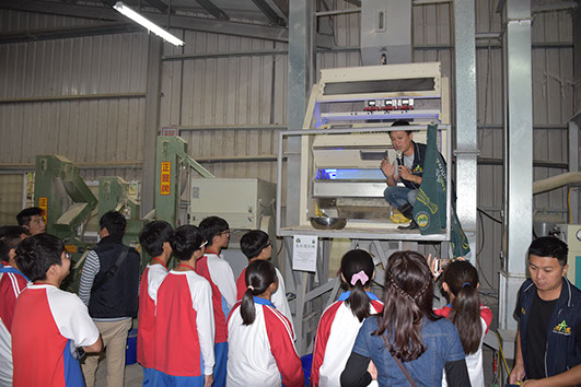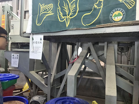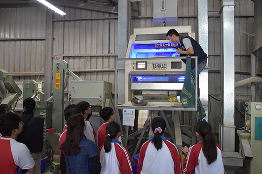 稻米選別機械的參訪行程我們安排在新豐農場參觀。稻米收割乾燥後通常都會有很多的雜物包括小石頭,首先我們參觀的是一台選石機,他是利用震動和摩擦的原理將小石頭篩選出來。