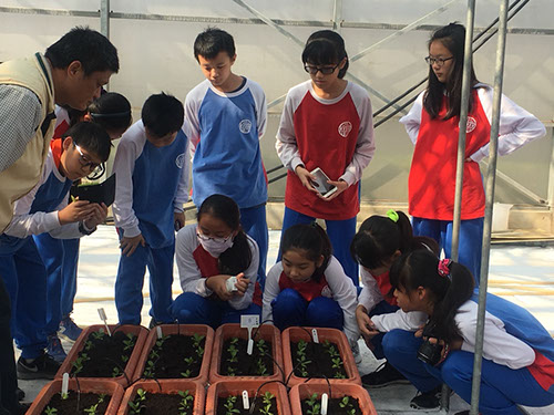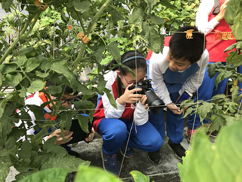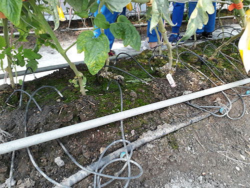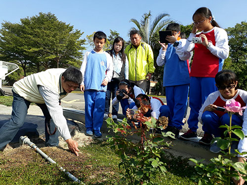 首先,我們在花圃發現了有小水滴,原來花圃裡布滿了管路,再接上滴劍做微噴灌澆水。接下來參觀番茄溫室,了解滴灌主機作用原理及觀察番茄生長情形及給水方式。這裡的番茄園也是採用滴劍供水及施肥。