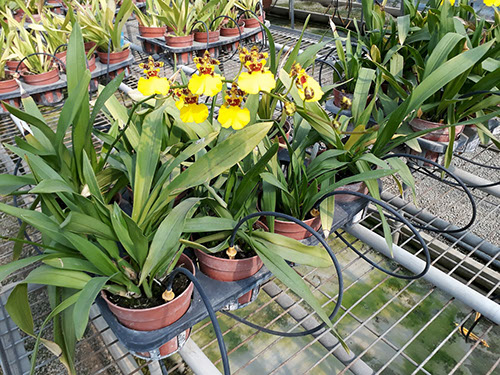 接著參觀文心蘭的栽培,文心蘭是用離地床架放置花盆種植,同樣使用滴劍灌溉。隔壁棟溫室是種植菊花,這裡的菊花有很多品種,非常特別。菊花是用土壤種植,使用迷宮式滴灌管路灌溉。最後我們到戶外玫瑰園區,這裡的管路也是使用滴劍方式灌溉。